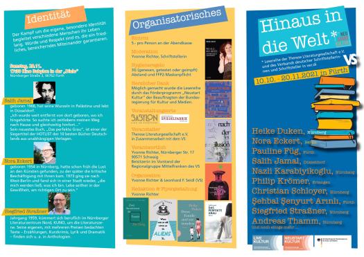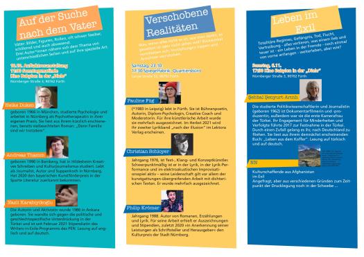 Mehrfach preisgekrönte regionale Autor*innen unterschiedlicher Genres und überregionale, erfolgreiche Literat*innen wechseln sich ab. Gewonnen werden konnten z. B. bekannte Nürnberger wie der Lyriker und Textjongleur Christian Schloyer und die hochinteressante Heike Duken mit ihrem Roman zur NS-Zeit, der wunderbare Erzähler Salih Jamal aus Düsseldorf oder die engagierte Nora Eckert aus Berlin.