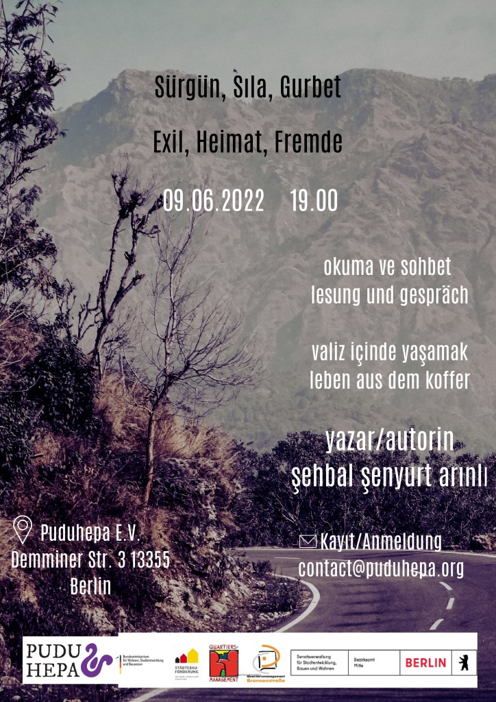 Şehbal Şenyurt Arınlı, eine ehemalige Stipendiatin des @Pen-Programms für Schriftsteller im Exil, wird Auszüge aus ihrem auf Türkisch und Deutsch erschienen Buch „Leben im Koffer“ lesen. Anschließend werden wir ein #Gespräch über #Exil, #Heimat und #Fremd, die sich wandelnde Bedeutung des Exils, Konzepte, die sich mit dem Exil verändern, sowie über Fortführung und Produktion führen.